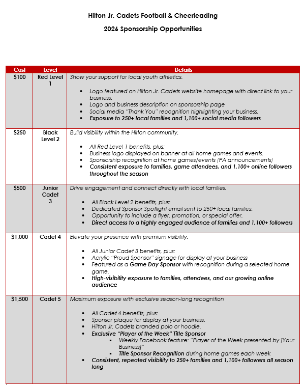 As a non-profit organization, we rely solely on volunteers for the operation of the organization, as well as fundraising in order to provide safe and essential equipment to our kids. As a corporate sponsor, your business will make an important contribution towards the purchase of things such as new and safe helmets, mats, equipment and uniforms. Being a sponsor of our program will also provide you with a tax incentive as we are a 501c3 non-profit organization. The Hilton Jr. Cadets pledge to create awareness of your generosity using the 3 levels of sponsorship below. Sponsors will be recognized at our home games, on our web site, and on our social media.